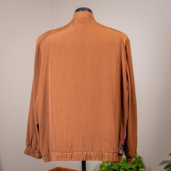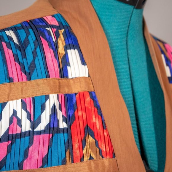 Rusty mustard color with 4 button closure. Has a fun textured and colorful design on front. Long-sleeved with elastic cuffs. Has shoulder pads that can easily be removed.