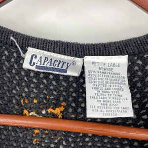 Vintage Capacity Sweater Vest Women Petite Large LP Black Ramie Cotton Knit 80s 90s. Light Wash Wear. 55% Ramie, 45% Cotton. Knitted Sleeveless Button Front. loose knit style sleeveless cardigan/vest with cute flower details. Grandmacore. Cottagecore crochet cottage granny