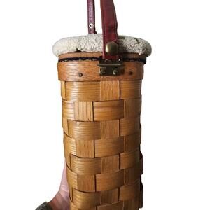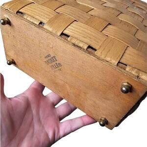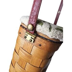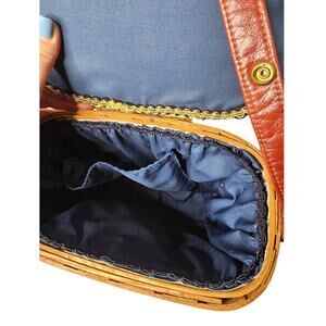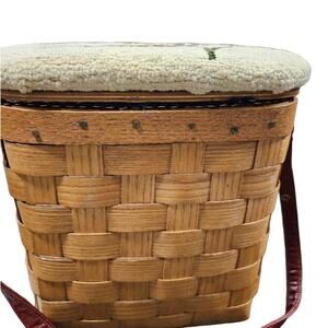 Vintage Cardinal Putney Basketville Vermont basket purse. This shoulder bag is truly a one of a kind. The cardinal lover, Bird lover, Christmas lover would genuinely love this bag. This bag has brass hardware. All basket is intact with no broken weaves and brass feet intact. Leather strap with no cracking or breakage. The purse measuring 10"X4"X10.5" and purse strap drop is 21". The interior is lined in a blue satin with one small blue side pocket and is trimmed in zigzag.