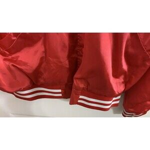 Vintage Cardinal Red Satin Bomber Jacket Mens L Basketball Logo. There are some flaws to the fabric. There is a tiny hole on the front about 4 inches from the shoulder. On the back underneath the basketball there is a pull or stretched portion about 7 inches long. The basketball design is vinyl and has some cracked places. Neither of these things are noticeable. Measurements laying are: