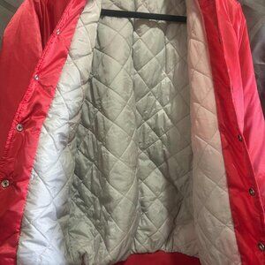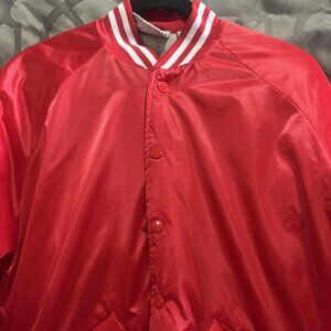 Bold and retro, this Cardinal satin bomber jacket brings vintage street style to life. Made from 100% nylon with a glossy finish, striped ribbed cuffs, and snap buttons. Perfect for casual layering or a sporty aesthetic. There is a small pink/red stain near the inner label (see photo), but not visible when worn.