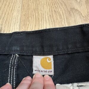 This product is a pair of vintage Carhartt B01 faded black double knee pants in size 36x32. Made of cotton with a mid-rise fit and classic carpenter style, these pants feature a distressed patina for a grungey 90s-inspired look. Proudly made in the USA, these pants are perfect for those who appreciate vintage American style and craftsmanship.