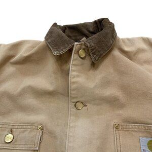 Vintage Carhartt Beige Chore Coat Corduroy Collar & Brass Buttons Sz 40 Oil Rig