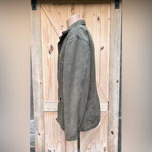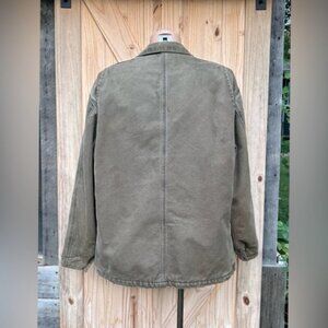 This Vintage Carhartt Brown Duck Blanket Lined Work Field Chore Jacket has buttons up the front, four pockets, buttons on the wrists and a blanket lining. It is 28 1/2" armpit to armpit, 22 1/2" across the back shoulders, 26" from the shoulder to the wrists and 31" long.