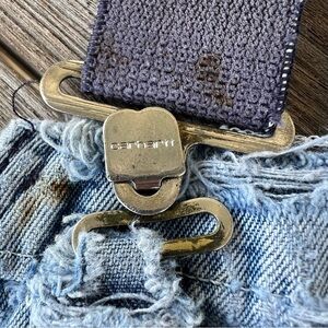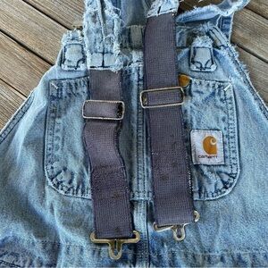 Vintage Carhartt Carpenter Bib Denim Overalls. These are in thrashed and destroyed work wear condition. They have stains, fraying, holes. The straps have lost their stretch. One clasp is missing (can be ordered from Carhartt or replaced with generic). Very, very distressed and worn!