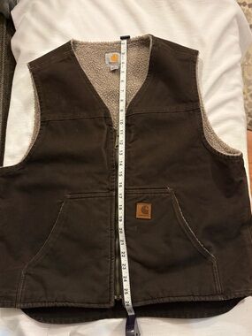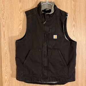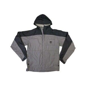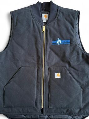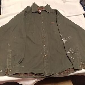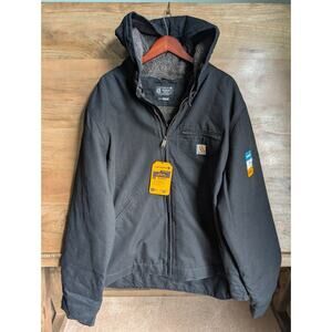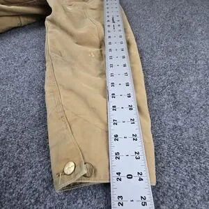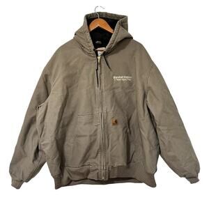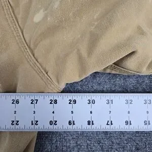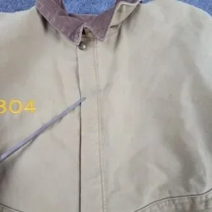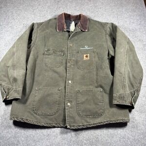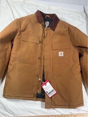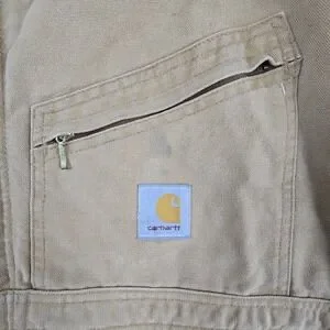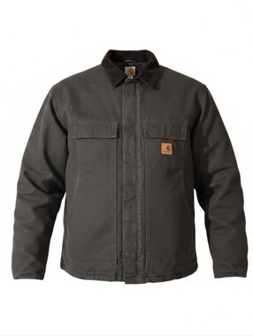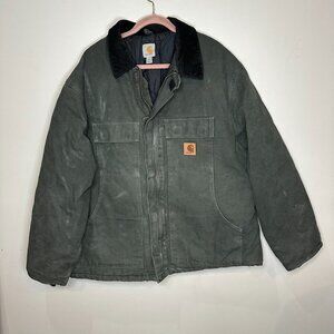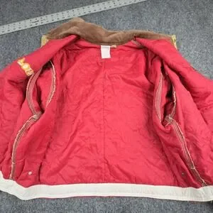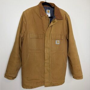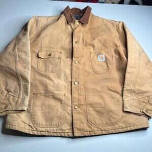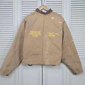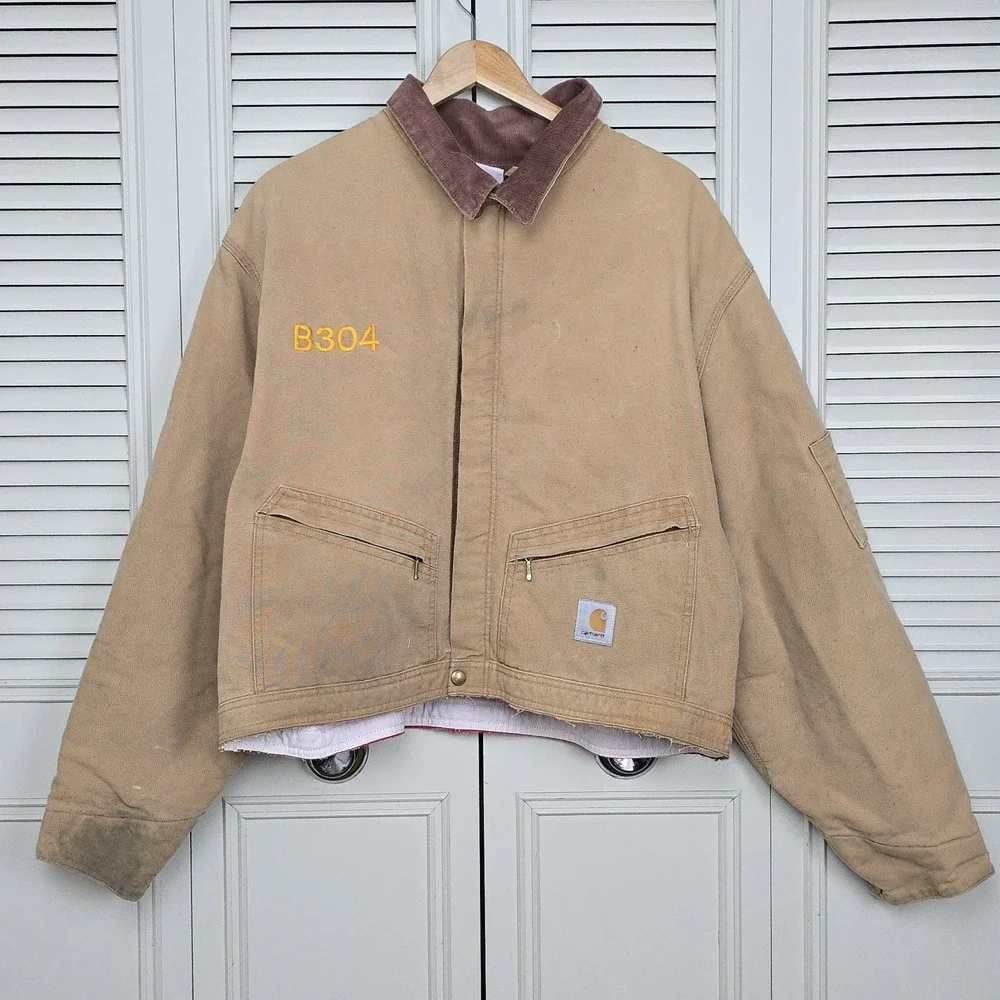 Vintage Carhartt Detroit work jacket in brown heavy-duty duck canvas with corduroy collar, cropped cut, and blanket/quilt lining; marked with B304 and Ford / Sterling Axle Plant graphics, believed early-'90s (date stamp 92 seen), with distressing, staining, and wear consistent with age and work use; cropped style with zipper pulls included (original zipper doesn't fully function as intended), functional neck snap buttons for a hood or liner attachment, roomy classic workwear fit — approximately 28″ pit-to-pit, 22″ length, and 24″ sleeve (see photos for details); ideal for collectors, workwear enthusiasts, and vintage Carhartt fans — make no mistake this is a unique piece of Americana with real character.
