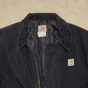 Step into true workwear heritage with this vintage Carhartt Detroit Jacket (J01 BLK) in classic black. Made in the USA and produced with union labor, this rugged duck canvas jacket features a quilted lining, brass zipper, and corduroy collar — built tough for decades of wear.