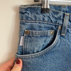 Perfect condition, suspected never worn vintage flannel lined Carhartt jeans. Loose mom fit, high rise, cool medium wash, leather logo tab on back and cloth one on front, brass hardware.