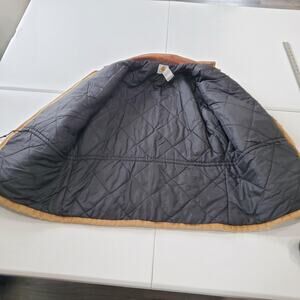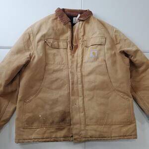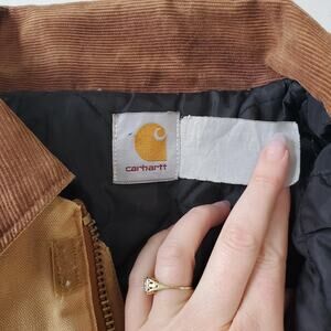 Outer shell is classic tan Carhartt duck canvas, brown corduroy collar, and quilted black lining for added warmth. Durable full zip front with snap storm flap. Signature Carhartt patch logo on chest. Two chest pockets with flaps, two large front hand pockets. Ribbed sleeve cuffs (fraying/distressed, see detailed photos).
