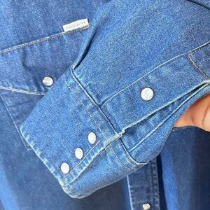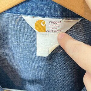 Crafted from durable denim, this vintage Carhartt shirt showcases Western-style charm with snap buttons and dual chest pockets. Ideal for rugged outdoor wear, it combines functionality with classic design, suitable for various settings. A timeless addition to any wardrobe.
