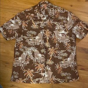 Vintage Caribbean Joe short sleeve button down shirt. Features a tropical palm tree and lounge chair print on a brown background. Linen. All tags removed. Excellent condition. Measures 26” across chest which is equivalent to a men’s XL.