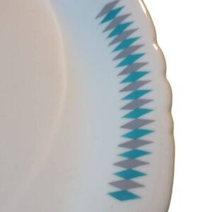Pre-owned mid-century modern serving plate by Caribr Puerto rico. Beautiful serving plate with scalloped edges and mid-century modern blue and gray diamonds. Measures 12.5 in across by 10 in. Very heavy nice. No crazing chips cracks. Experienced seller will be packaged well for shipping.