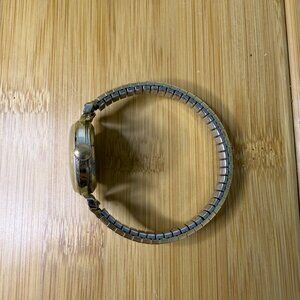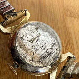 Good condition! Fair cosmetic condition - very little wear on the dial or band, but the case back has some damage which is not visible while wearing the watch. Overall looks good for an early 1950s model. This is not currently running. It is a mechanical (manual wind-up) model which is overwound, and will need to be cleaned and serviced to run properly. Gold tone case and stretch metal Speidel band. The dial is silver with gold tone minimalist accents. Definitely a rare and unique find once it's up and running!