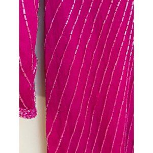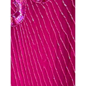 Vintage Carina pink silk hand-beaded dress, XL - please refer to measurements below for fit. This dress does have some flaws, but is still wearable and has life left to it. Please see all the photos, as I have taken photos of the flaws that include, but may not be limited to: Small areas where tiny beads are missing; there’s a hole near the left arm seam. The hole appears to be on the outer lining and is barely noticeable. See photos.