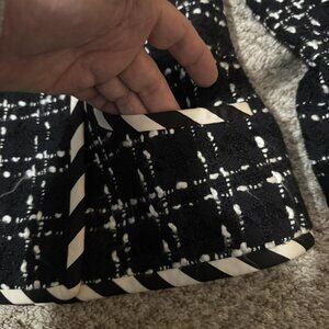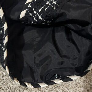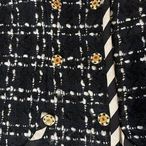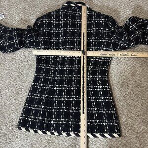 Color: Black with white plaid tweed outer and black and white diagonal stripe silk trim along lapel, front edges, pockets, cuffs, and hem.