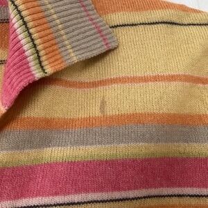 Vintage Carlisle Sweater Top Striped V Neck Collared Ribbed collar and sleeves Small spot - see photo Good vintage condition Pink, Mustard Yellow, Grey and Orange striped knit top. Silk and cashmere blend. Runs small Tags: Vintage, Retro, 70's, 80's