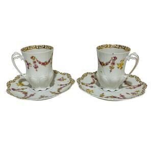 Vintage Carlsbad Austria porcelain demitasse tea cup & saucer sets - two matching sets of delicate white porcelain adorned with pink and yellow rose garlands and goldtone highlights on the rims. Shapely teacups with ornate handles - suacer rimes with detailed scallop design. Clearly hallmarked with a double stamp mark. A minor chip on one teacup foot - otherwise in excellent vintage condition - perfect set to use or gift to someone special.