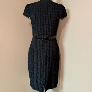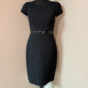 Vintage Carmen Marc Valvo puckered wiggle dress with patent leather black belt. A true beauty in amazing condition All puckered black fabric. Size 6