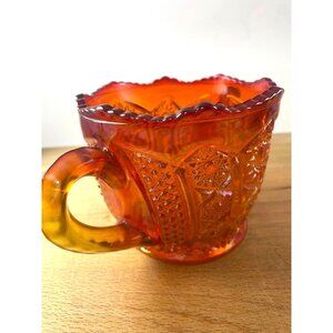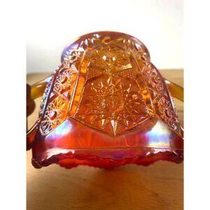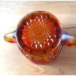 This exquisite Indiana Heirloom Sunset Carnival Glass Open Sugar Bowl with double handles showcases a stunning blend of warm amber and fiery red hues, creating a captivating iridescent glow. Its intricate starburst patterns are reminiscent of timeless craftsmanship, offering both elegance and functionality for collectors or enthusiasts of vintage glassware. The dual handles add to its charm, making it a beautiful piece. It measures approx 4 3/4" x 4 1/2", not counting the width of the handles.