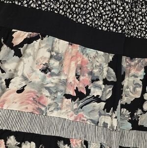A rare, elegant VINTAGE Maxi Skirt featuring a captivating Floral and Striped Patchwork design. This exquisite piece embodies the romantic, moody aesthetic of Whimsigoth and Dark Academia, blended with soft cottagecore femininity. Perfect for making a distinguished statement. ​Detailed Luxury & Design ​Design: An artful patchwork of moody floral panels and sophisticated black and cream stripes. The overall effect is one of deep texture and visual interest. ​Fit & Silhouette: Tailored with a graceful, high-waisted fit that flows into an A-line maxi silhouette, promising both comfort and dramatic movement. ​Aesthetic: Truly a collector's piece that seamlessly bridges the mystery of the Witchy/Goth aesthetic with the refined softness of a high-end prairie style. ​Measurements: Waist is flexible (16in to 21in), with a sweeping 31in length. Condition Note: Excellent vintage condition. There is a small hole along the inside of the waistband, which is not visible when worn (insideout). Priced accordingly. ​Keywords: Whimsygoth, Cottagecore, Fairycore, Witchy, Prairie, Vintage, 90s, Y2K, Maxi Skirt, Floral, Stripe, Patchwork, A-line, Flowy, High Waist, Black, Cream, Tan, Pink, L, Large, Plus Size, Boho, Bohemian, Dark Floral, Goth, Romantic, Elegant, Statement