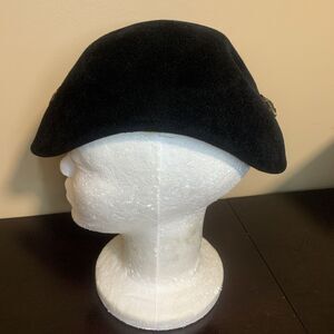This vintage black velvet hat by Fisk Hats is an original piece that will make a statement in any collection. The hat features two beautiful jeweled insects that add a touch of elegance to the overall design. The one size fits all aspect makes it easy to wear and the material is soft and comfortable. Perfect for any vintage hat lover, this piece is sure to turn heads.