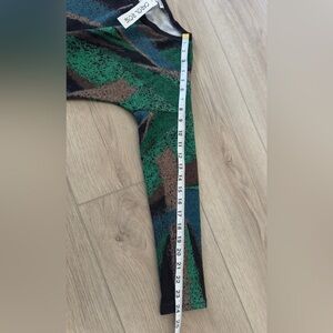 Chic top with abstract patterns. Features green and brown hues. Perfect for stylish outings.