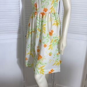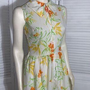 Lightweight sleeveless collared mid century midi dress with front zip closure. Soft flowy textured sunny floral print. 100 percent polyester. Pleated waist no stretch. Excellent vintage condition. Women’s Size 14. Please see measurements below.
