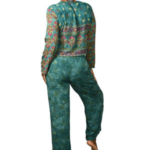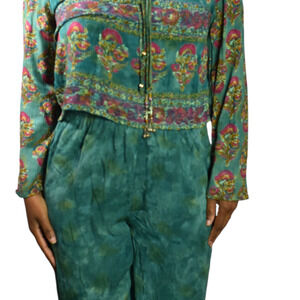 Vintage 80s 90s Carole Little Petites casual pant suit FEATURES a bohemian cloud dye and paisley matching set. The top is boxy with long sleeves and a two sets of jeweled tassels. Pants are pull on with elasticized waist. Straight pant legs.