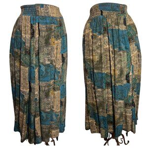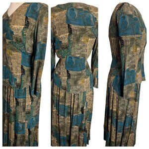 Vintage Classic Carole Little petites outfit, size 4, featuring a buttoned blouse and midi skirt. Both pieces flaunt a unique blue-brown patch design. Made of 100% Rayon from Germany. Blouse has pleated, long sleeves and shoulder pads, Skirt has elastic waist. and midi length with an A style. Lightweight