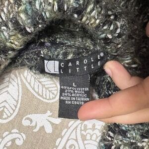 ✨ Vintage textured knit jacket by Carole Little, size Large. Features a rich wool-blend boucle in earthy green tones with flecks of blue, yellow, and grey. Oversized foldover collar with a glossy marbled button at neckline, open front swing silhouette, and long sleeves. 49% polyester / 27% wool / 24% acrylic. Made in Taiwan. Cozy yet elevated — perfect for cool weather layering.