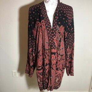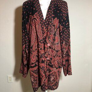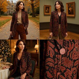 This rare Carole Little for Saint-Tropez West jacket is the epitome of late-’80s sophistication. Crafted with German-woven rayon, the jacket features a fluid drape and is adorned with ornate rose-etched vintage buttons. The deep black & clay-red paisley pattern reflects the era's luxurious bohemian elegance, making this piece feel like wearable art.