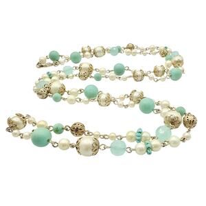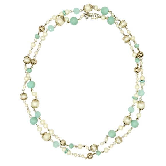 This exquisite signed Carolee necklace features one long strand of softly shimmering faux pearls, frosted aqua beads, and silver-tone filigree spheres that can be doubled up. Each bead is individually linked by hand, showcasing Carolee’s signature attention to detail and refined craftsmanship.