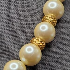 *Description: This is a beautiful vintage Carolee glass pearl necklace with gold tone accent beads and a faux pearl and gold tone box clasp. The clasp is stamped Carolee on the bottom. The necklace has 15mm glass pearls in an off white. This would be a great addition to your jewelry collection or make a great gift!