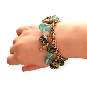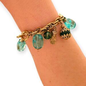 Add a touch of vintage glamour to your wardrobe with the Vintage Carolee Gold Chunky Aqua Blue Multi-faceted Beaded Charm Bracelet. Featuring antique gold, tassel charms, and bead charms, this piece offers a unique and stylish addition to any outfit. The bracelet also showcases a Carolee signature engraved heart charm that adds an extra touch of elegance to this bold accessory.