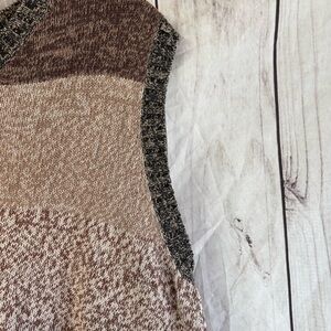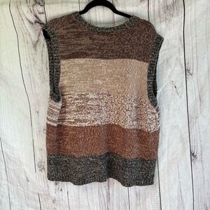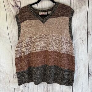 Stylish knit sweater vest. Features a mix of earthy tones. Perfect for layering.