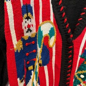 Tag says small, but it is very oversized. Celebrate the season with this festive holiday cardigan sweater. Featuring a vibrant black and red design, it's perfect for adding a touch of cheer to your wardrobe. Great for “ugly” Christmas sweater parties.