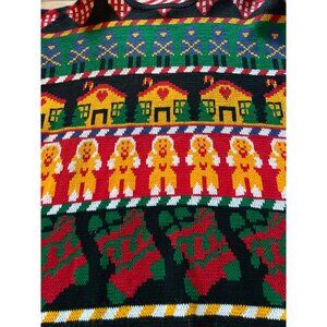 A vibrant, festive sweater featuring a playful Christmas design with gingerbread men, houses, and roses. Durable and soft acrylic material ensures comfort.