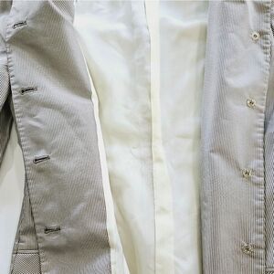 This is a beautiful vintage skirt suit by Carolina Herrera. Made from a pinstriped 100% silk fabric. This two piece ensemble features a high waisted skirt with impeccably tailored hips, hidden back zipper, and a kick vent in the back. The jacket can be worn open or closed. Features a fitted officer collar, long sleeves, button fastening, vertical bust darts, and buttoned cuffs. Both the skirt and the jacket are fully lined with a soft cream colored satin. These would look coot separately. I could see the jacket dressed down with a pair of jeans or the skirt paired with a cute tee shirt and sneakers. This is a true vintage item. It is a size 10 but please note that vintage sizes tend to run smaller. I have included the measurements below. This set is in excellent vintage condition. It is a gorgeous piece of fashion history. I wish that I could find the runway photo from the archives but I have had no luck as of yet.