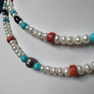 Vintage Carolyn Pollack Pearl Necklace Red Coral Turquoise American West 24"