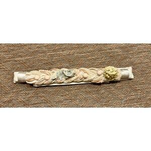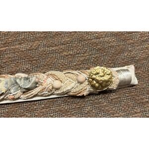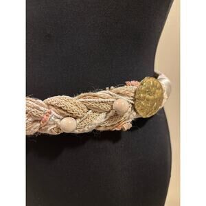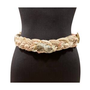 This vintage belt from Carolyn Tanner Designs is a must-have for any fashion-forward woman. The multi textured braided design in a beautiful shades of Cream with metal beads and more. Grossgrain ends make this perfect for adding a pop of color to any outfit. The hook and loop closure ensures a secure fit, while the adjustable waist allows for a comfortable and tailored fit.