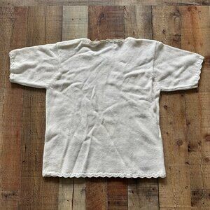 This classic Carolyn Taylor sweater features delicate floral embroidery and pearl accents. Crafted from a ramie-cotton blend, it's lightweight yet durable for versatile wear.