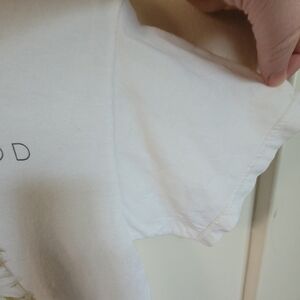 great condition, no pit stains. very crisp white still. one small spot where I had to really look to find it, see pic.