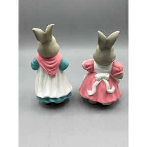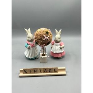 Carrot Patch Dept. 56 bunny duo with maypole tree. The bunnies are in good pre-owned condition. However, the bunny in the pink dress has a small crack on her ear. It is not a repair; I suspect it is a manufacturer flaw. See photo 8.