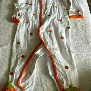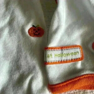 Vintage Carter’s Bundle. Red Dress pleaded front button back. Top with gray, green and pink polkadots, button back. Gray cardigan, 3 green big buttons, Argyle pattern on bottom. Halloween onesie, white with pumpkins and orange trim. Red leggings, embroidered flower on leg, elastic waist and ankles.