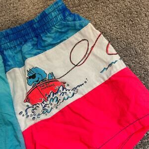 Vintage Carter's Dinosaur Swim Trunks. Size tag faded, so please check measurements to ensure fit. (Looks around a 2T to me, but definitely flexible depending on the length you prefer on your kiddo!) Super fun color block style bathing suit shorts with water skiing dinos! Mesh lining and elastic waist. Great condition!
