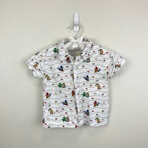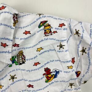 Vintage Carter's Hippo Beach Shirt. No size tag, so please check measurements to ensure fit. (I'd guess around a toddler boy 2T or 3T.) Casual collared button front shirt with chest pocket. White with colorful stars, suns, and hippos lounging and surfing at the beach! Some small light marks (see last photo; untreated).
