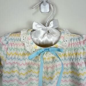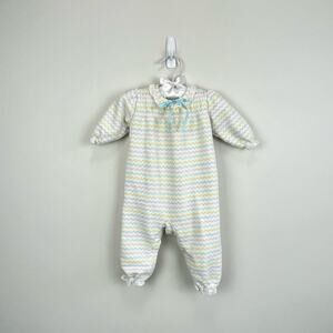 Vintage Carter's Pastel Striped Coverall. Baby girl size 6 months. USA made. Cozy long sleeve one piece outfit. Fun chevron stripes, white eyelet ruffle at the collar and cuffs, and blue ribbon bow, too. Snaps in the back and along the legs. Great condition with no flaws noted!