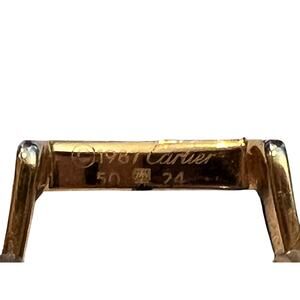 A rare and elegant pair of vintage Cartier eyeglasses, crafted in 1987 with a sophisticated folding bridge design and finished in a rich gold-tone metal. Marked Cartier 50 â–ˇ 24, these frames also include the original brown protective leather case with gold corner details and embossed logo.