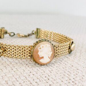 Vintage Carved Cameo Goldtone Victorian Revival Mesh Retro Classic Bracelet