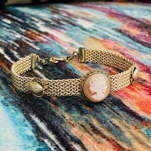 Vintage Carved Cameo Goldtone Victorian Revival Art Deco Mesh Retro Classic Coastal Nautical Seashell Bracelet: